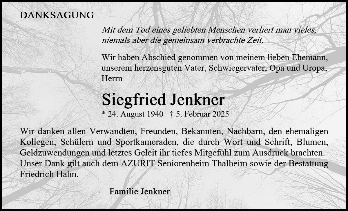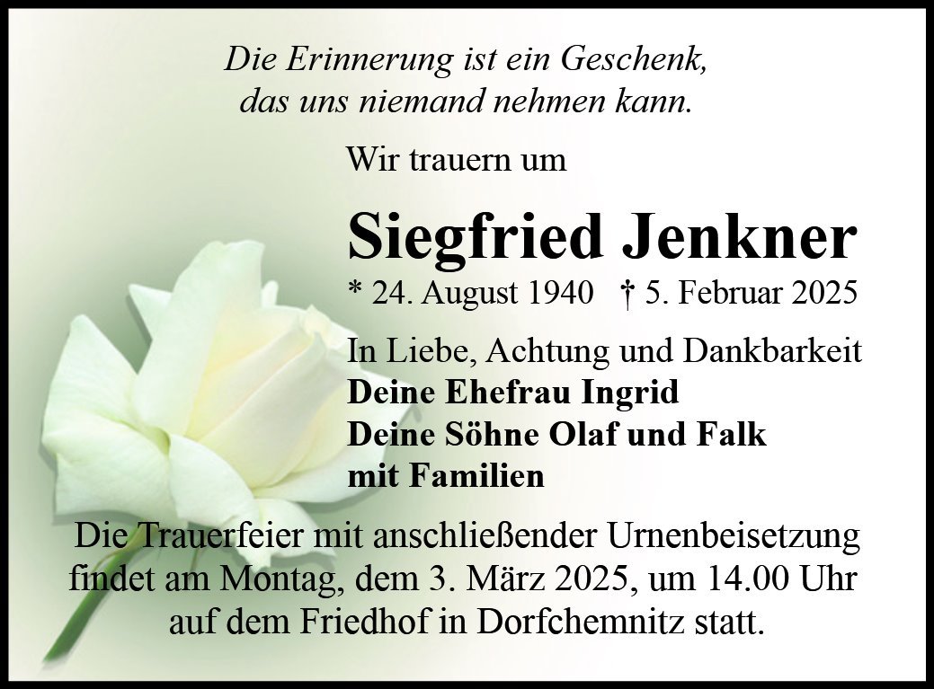 wir wünschen Ihnen für die kommende Zeit viel Kraft und dass es Ihnen gelingt, dankbar auf die positiven Erinnerungen zurückzublicken. Diese Gedenkseite möge Ihnen dabei helfen, Ihre Trauer zu teilen und das Andenken gemeinsam wachzuhalten.